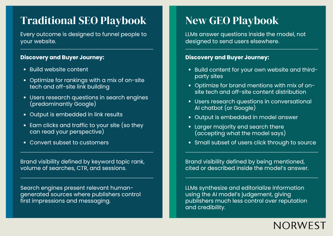 To test my assumptions and build a deeper perspective, I went straight to traditional SEO experts who are navigating this transition in real time. After a handful of coffee chats and dozens of hours of research, I’m convinced this is not an evolution of a tactic or a channel. GEO is even more urgent for the most senior marketing leaders to understand than I’d originally thought. Here’s what I’m sharing with our portfolio leaders.